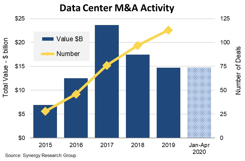 Data center-oriented M&A deals that closed in the first sixteen weeks of 2020 has already surpassed the 2019 total, according to new data from Synergy Research Group. Synergy has so far identified 28 data center-oriented M&A deals that have closed this year.